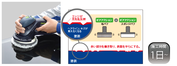キズのエッジ部分を取るとともに、塗装面全体が滑らかになるように磨き、鏡面状態にする研磨。